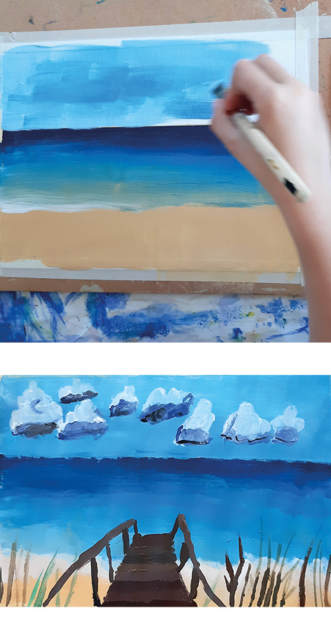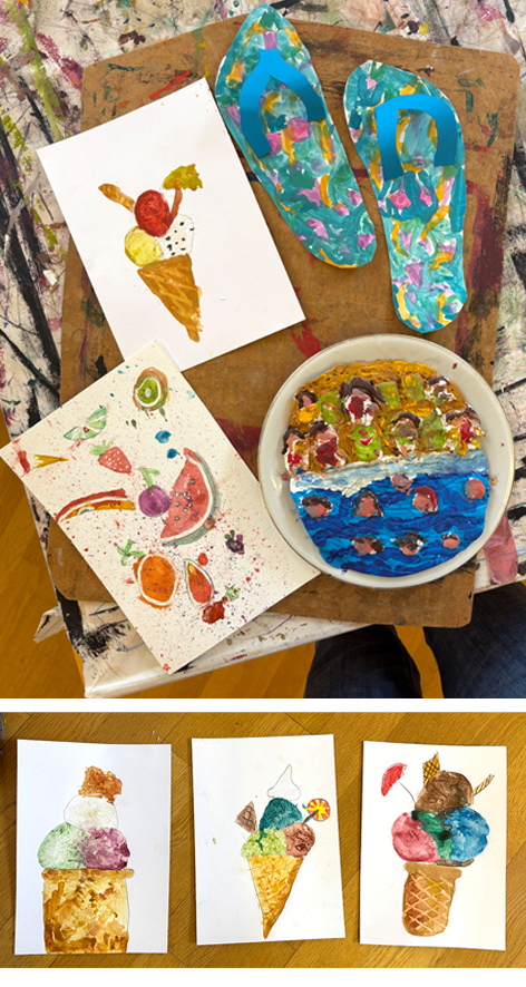 Wir holen uns den Sommer aufs Papier und tauchen ein in Sonne, Strand und Urlaubsstimmung. Mit Strukturpaste, Sand aus Luberegg und Aquarellfarben erschaffen wir ein sehr haptisches Bild, das nach Ferien, Urlaub und Eis erinnert.